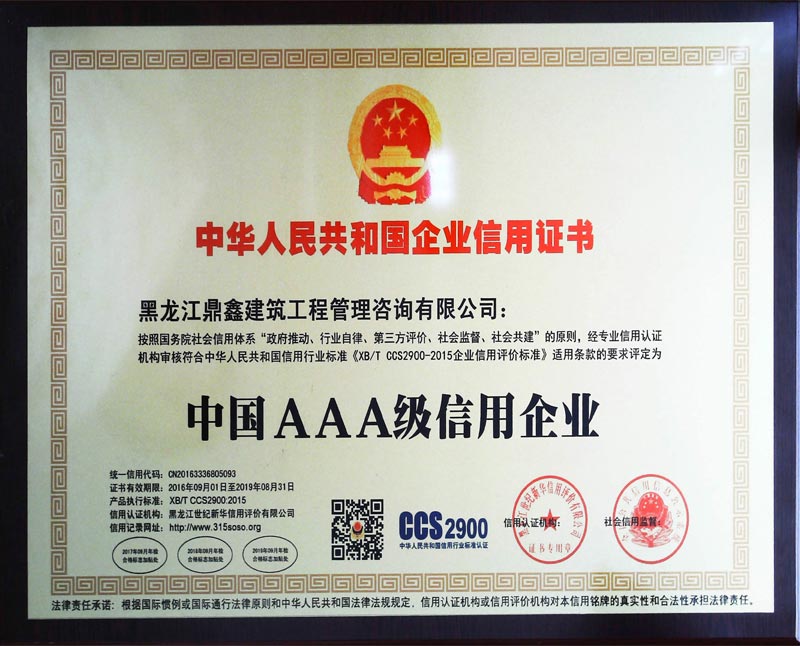 中國AAA級(jí)信用企業(yè)證書